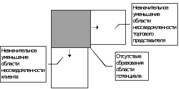 Рисунок 20. Области знаний в матрице JADIK. На стадии завязки отношений между клиентом и торговым представителем клиент знает то, чего может не знать торговый представитель. Это область неосведомленности торгового представителя. Такая информация включает как личные, так и профессиональные данные. Это пока неизвестная область представляет собой зону, в которой торговый представитель не знает ни запросов, ни пожеланий, ни потребностей клиента. Торговый представитель тоже обладает информацией, которая пока не известна клиенту. Эта информация может включать сведения о продукции или услугах компании торгового представителя. Сюда также могут входить как личные, так и профессиональные сведения. Это область называется областью неосведомленности клиента, которая состоит из информации, которой обладает торговый представитель, но которая неизвестна клиенту. Область потенциала представляет собой информацию, которая еще не осознана или неизвестна ни торговому представителю, ни клиенту, но может быть осознана по меньшей мере одним из них в ближайшее время. Эта область не ограничена и представляет основу для будущих деловых отношений. Матрица JADIK является динамической структурой и, поэтому как и сами отношения, она может трансформироваться. Эти изменения можно представить смещением горизонтальных и вертикальных линий, разделяющих матрицу на области. Путем тонкого и грамотного использования системы позиционных продаж (процесс исследования и процесс презентации) торговый представитель может управлять ходом встречи, направлять развитие отношений в нужное русло. По мере того, как расширяется область общеизвестных фактов, сокращаются области неосведомленности торгового представителя и клиента, происходит расширение области потенциала. Торговый представитель использует процесс исследования для выявления потребностей клиента. Он задает клиенту пять вопросов и внимательно выслушивает его: при этом область общеизвестных фактов расширяется в стороны, а область неосведомленности торгового представителя сокращается. Таким образом торговый представитель узнает о его потребностях, проблемах, что и определяет разрыв между желаемым и действительным результатом. Процесс презентации служит для представления информации о программах, продукции или услугах, для рассказа о компании торгового представителя. При этом область общеизвестных фактов расширяется в вертикальном направлении, следовательно, уменьшается область неосведомленности клиента. Таким образом, клиент получает информацию от торгового представителя. Наиболее продуктивные и полезные отношения устанавливаются в результате сбалансированного использования процессов исследования и презентации. Тем не менее, на практике некоторые торговые представители используют один процесс в ущерб другому. В этом случае область общеизвестных фактов не растет равномерно в обоих направлениях. Здесь можно выделить три стереотипа торгового представителя, не соблюдающего баланс: Допрашивающий торговый представитель, Презентер и Визитер. Допрашивающий торговый представитель задает слишком много вопросов, вынуждая клиента говорить "за двоих". Он почти не рассказывает ничего о самом себе, своей компании и ее продукции. Поведение такого торгового представителя можно изобразить р