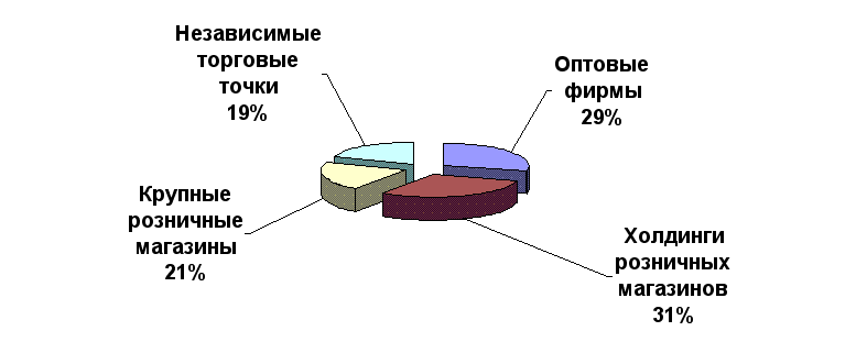 Рассмотренные выше каналы могут быть организованны в холдинги розничных магазинов и сети торговых точек. Сетью торговых точек (или “организованым” клиентом) - является любая фирма владеющая несколькими (2 и более) торговыми точками, причем эти торговые точки могут принадлежать различным типам, (например 2 киоска магазин и ресторан). При этом такие сети можно сегментировать следующим образом: