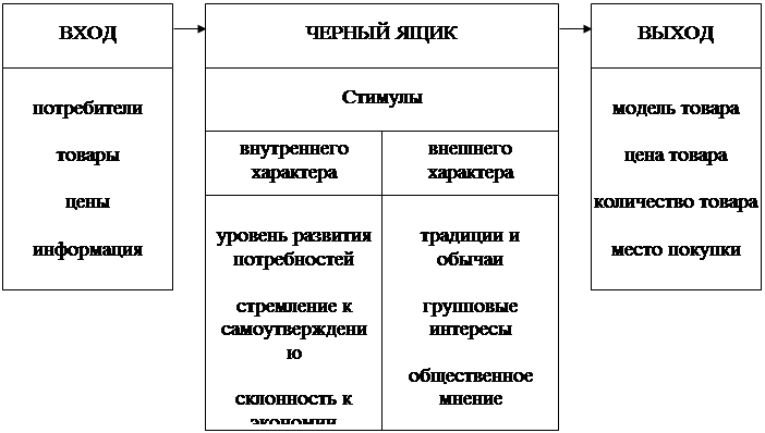 Потребности в самоутверждении Потребности в уважении Социальные потребности Потребности самосохранения Физиологические потребности Опыт маркетинговой деятельности показывает, что ориентация на полезность продукции требует глубокого знания психологических, мотивационных факторов, которые становятся решающими при покупке товаров. Можно выделить ряд таких мотивов. 1. Мотив выгоды. 2. Мотив снижения риска. 3. Мотив признания. 4. Мотив удобства. 5. Мотив свободы. 6. Мотив познания. 7. Мотив содействия, соучастия. 8. Мотив самореализации. 16. Основные этапы процесса принятия решения о покупке товара. Важным шагом в моделировании поведения конечного потребителя на рынке является этап принятия решения о покупке. Покупка – это всегда компромисс, ожидаемый риск. Одним из методических подходов в решении данной задачи служит модель «черного ящика»:
