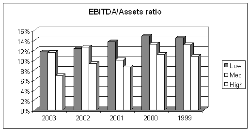 По показателю прибыльности активов картина получается более сглаженной. Разница в пользу специализированных компаний составляет около 130%, или, в абсолютных величинах, соответственно, 22% против 9% у широкодиверсифицированных. Интересно, что по показателю использования активов компании со средним уровнем диверсификации оказываются значительно ближе к фирмам, использующим концентрированные модели бизнеса. Их показатель EBITDA/total assets составляет в среднем 17%. Более того, по данным за 2002 год компании со средним уровнем диверсификации показали лучшие результаты, чем концентрированные компании.