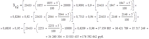 где ОР= 50 960 000 объем реализованной продукции за прошлый год, руб. Если принять, по результатам анализа за прошлые года, что программа будет расти примерно на 5 % в год, а принятый расчетный период равен 5 годам, можно определить экономический эффект от внедрения мероприятий по совершенствованию: