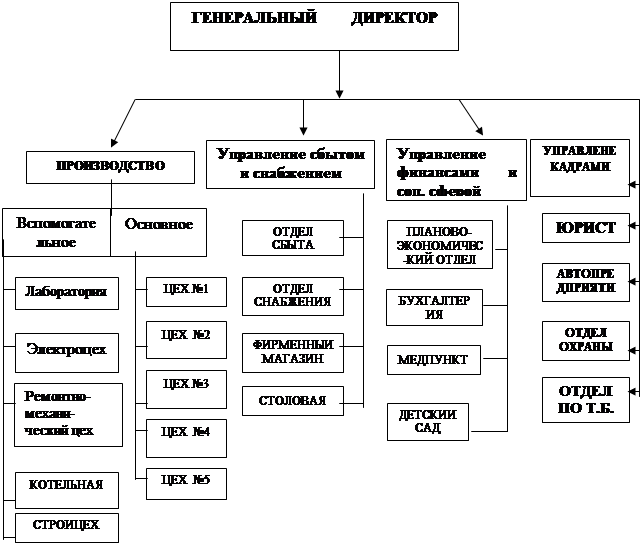 Рисунок 1.4 Сетевой график мероприятий по продвижению товара в случае 4 Таким образом, в случае контррекламы бюджет public relations минимум в 3-4 раза превысит бюджет стандартной рекламной кампании фирмы. Необходимо заметить, что сила воздействия различных средств продвижения будет максимальной в том случае, когда их стиль, содержание, оформление и время проведения планируются централизовано и проходят в одном ключе. 2 ОРГАНИЗАЦИОННО – ЭКОНОМИЧЕСКАЯ ХАРАКТЕРИСТИКА ПРЕДПРИЯТИЯ ЗАО КОНДИТЕРСКАЯ ФАБРИКА «МАЙКОПСКАЯ» 2.1 Общая характеристика предприятия: правовое положение, организационная и производственная структуры управления. Кондитерская фабрика «Майкопская» находится на восточной окраине г. Майкопа по улице Пролетарская, 2. Фабрика была основана на базе Горпищекомбината (ГПК). ГПК был основан в 1943 году и занимался обеспечением фронта: продуктами переработки овощей и фруктов, т.е. вырабатывал соки и овощные консервы. Кроме того, вручную вырабатывалось небольшое количество карамели и безалкогольных напитков. ГПК располагал садом (18 га), 22 га – виноградник, 2 га – ягодник (клубничник); 45 га – бахча, 174 га – огород, включавший в себя пасечное хозяйство с 74 пчелиным ульем. Подобным образом ГПК работал до 1974 года, когда был преобразован приказом № 348 Министерства пищевой промышленности РСФСР и Управлением пищевой промышленности Адыгейского облисполкома в кондитерскую фабрику. На момент создания фабрики годовой объем продукции составлял 3,5 тыс. т. В этот период уже были установлены следующие линии: конфетная линия, линия по выработке драже, карамельная линия. С периода образования были введены следующие цеха: «розничный» и цех «Восточные сладости» (из-за ограниченности производственных площадей построенные на 2-м этаже карамельного цеха). В 1998 был официально введен в эксплуатацию цех № 5 – цех по подготовке и переработке сырья. К административному зданию были пристроены в 1981 году зефирный цех ( в нем в 1997 г. была также открыта линия по производству шоколадных фигур), в 1987 г. – поликлиника. В 1992 году фабрика преобразована в процессе приватизации путем выкупа арендованного имущества в ЗАО Кондитерская фабрика «Майкопская». В 1993-99 года на фабрике вводилось в действие несколько линий по производству вафель, шоколадных батончиков и вафельных конфет. В 1998-99 гг. был проведен «евроремонт» фабрики, в результате которого административное здание предприятия стало современным деловым офисом с великолепной внешней и внутренней отделкой. Уставной капитал общества составил около 14 млрд. рублей в масштабе 1992 года (по нынешним показателям это около 48000 $, как указано в бизнес-плане на 1999 год). Учредителями предприятия являются физические лица – граждане Российской Федерации. Председателем ЗАО является Цей Асланбий Кайсимович. Фабрика занимает площадь 6,6 га, здания и сооружения – 3,2 га от общей площади, 2,0 га из них производственные площади. Организационная структура предприятия утверждается Советом предприятия в составе 35 человек. Они являются ведущими мастерами производства, начальниками цехов, различных служб. В своей работе Совет руководствуется отсутствием простоев на тех или иных участках производства. На последнем заседании Совета была выработана следующая организационная структура согласно рисунку 2.1. Производственная структура пр