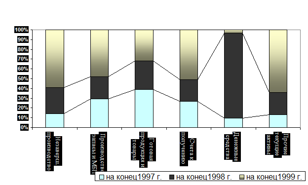 Основными составляющими постоянных активов (внеоборотных активов) на конец 1999 года составляют основные средства 29,28% или 23795 тыс.руб., хотя их доля в структуре активов уменьшилась на 11,9 % по сравнению с 1998 годом, а доля незавершенного капитального строительства увеличилась в 2 раза и составила на конец отчетного периода 6,87% или 5542 тыс. руб. Это объясняется тем, что на фабрике ведется капитальное строительство, достраивается административное здание и ведется реконструкция цеха №1, а снижение доли основных средств связано с осуществленной переоценкой основных фондов на ряду с тем, что предприятие за 1999 год не осуществляло сколько-нибудь значимых инвестиций в основные фонды. Как видно из рисунка 2.2 оборотные средства в активе баланса занимают большую часть (54% в 1997-1998 гг., и 63% в 1999 г.), что является положительной тенденцией, т.к. маневренность предприятия повышается.
