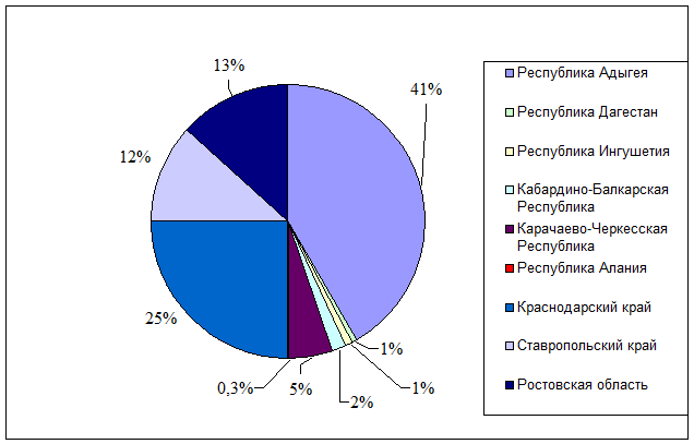 Рисунок 3.3 Объемы сбыта продукции ЗАО Кондитерская фабрика "Майкопская" на Северном Кавказе На рисунке 3.2 видно, чо 85,3% продукции фабрики реализуется в Северо-Кавказском регионе. Кроме того, как иллюстрирует рисунок 3.3, 41% и 25% сбыта приходится на Республику Адыгея и Краснодарский край соответвенно. Таблица 3.3 Емкость рынка кондитерских изделий Северо-Кавказского региона и доля фабрики на данном рынке