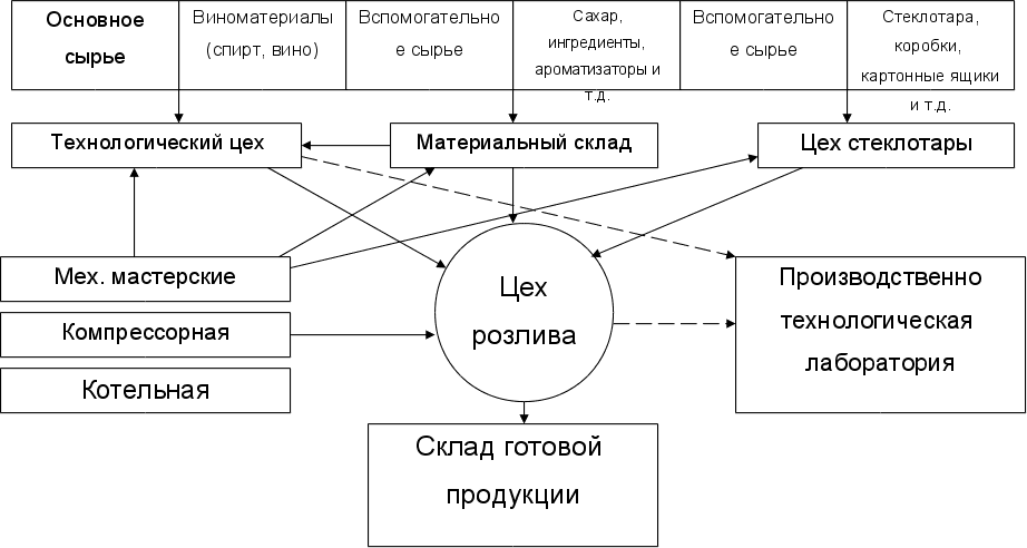 Главный инженер отвечает за технику производства, техническую политику предприятия, внедрение научно-технических достижений и передового опыта лучших предприятий. Инженер по ТБ и КР (технике безопасности и кадровой работе) занимается обеспечением безопасности на предприятии, а также кадровым вопросам. Оформление всех договоров предприятия, а также другие юридические вопросы находятся в ведении юрист-консульта. Главному экономисту подчиняется планово-экономический отдел, в состав которого входят инженер по организации и нормированию труда и экономист по планированию, где составляют текущие и перспективные планы и осуществляется технико-экономический анализ производственно-хозяйственной деятельности предприятия и т.д. В ведении главного бухгалтера находится отдел бухгалтерского учета, в состав которого входят заместитель главного бухгалтера, бухгалтер-финансист, бухгалтер по реализации, бухгалтер расчетного стола, бухгалтер по учету тары, кассир и программист. На предприятии также имеется должность заместителя директора по снабжению и сбыту,. которому подчиняются начальник МТСиС (материально-технического сбыта и снабжения), товаровед и мастер погрузочно-разгрузочных работ. Вопросами капитального строительства, капитального ремонта занимается заместитель директора по строительству, которому подчиняется стройучасток. Заведующий канцелярией занимается текущим документооборотом и другими аналогичными функциями. В непосредственном подчинении директора находится коммерческий отдел, включающий инженера по коммерческим вопросам. Инженеру подчиняются заведующие магазинами, в т.ч. фирменными и баром. Таким образом, на предприятии действует линейно-функциональный (смешанный) тип организационной структуры. Производственная структура предприятия предоставлена на рис. 1.3.2. Рис. 1.3.2. Схема производственной структуры ОАО «Винзавод «Георгиевский»