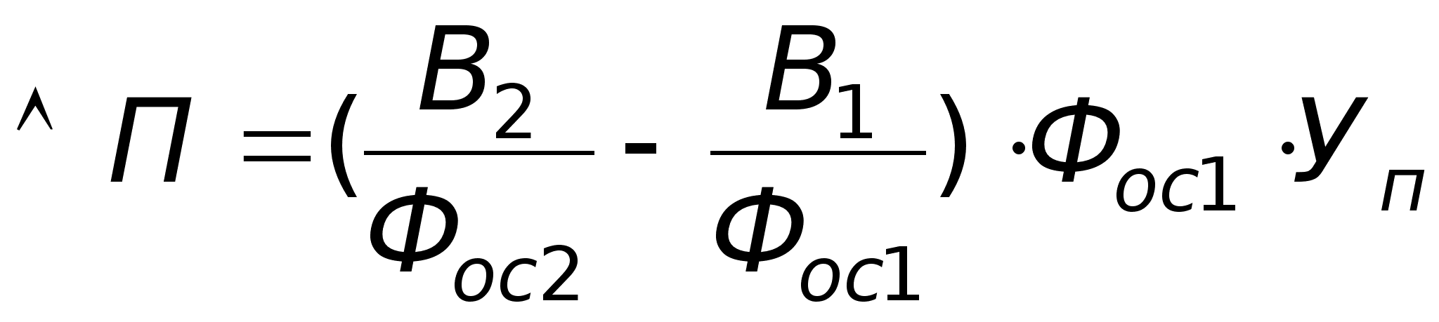 где В1, В2 – объем произведенной продукции в предыдущем и отчетном периоде, р.; Фос1, Фос2 – среднегодовая стоимость основных производственных фондов в предыдущем и отчетном периоде, р.; Уп – удельный вес прибыли в объеме производственной продукции.