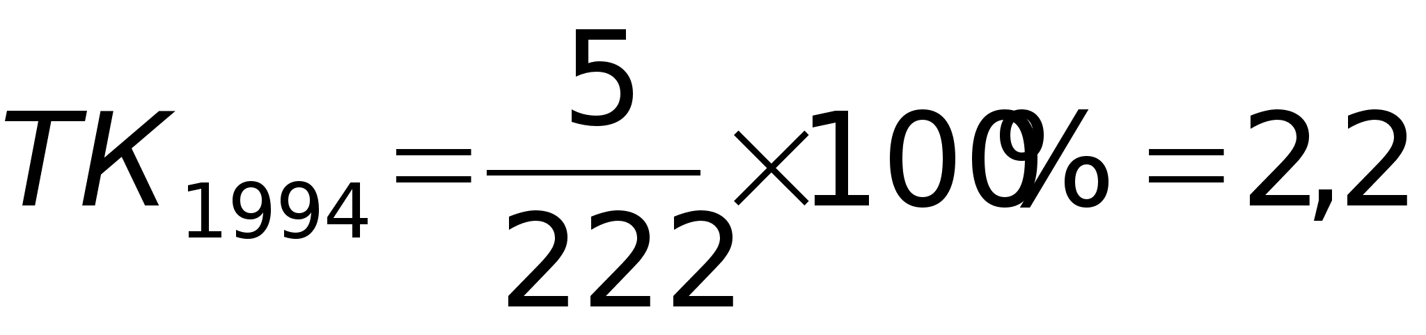 Уменьшение выработки связано снижением объема производства с 558,0 тыс. дкл. в 1995 г. до 186,0 тыс. дкл. в 1996 г. за этот же период на 17 человек увеличилась среднесписочная численность за счет работников магазина № 21. Однако, в 1997 г. среднесписочная численность незначительно сократилась и составила 235 человек, а выработка равнялась 1,06 тыс. дкл. Увеличение объемов производства до 249,0 тыс. дкл. главный фактор увеличения выработки на 20,4 % в 1997г. В отличие от 1997 г. в 1998г. объем продукции, а следовательно, и выработка снижаются до 174,7 тыс. дкл. и 0,85 тыс. дкл., соответственно, а численность работников уменьшается до 206 человек. Тенденция в динамике выработки за 1994 – 1998 г.г. не выявляется. В отдельные года (1995, 1997г.г.) производительность растет по сравнению с предыдущими годами, а в отдельные годы (1996, 1998 г.г.) – падает. В обще же, показатель выработки за последние 3 года значительно уменьшается, т.е. при незначительном измерении численности, значительно сократились объемы производства продукции. Изучение постоянства состава производится с использованием коэффициента оборота по приему и выбытию (формула 2.11 и 2.12), коэффициента текучести и коэффициента постоянства кадров. Коэффициент оборота по приему и выбытию в 1994 г. равны 3,1 %, а в 1995 г. – 2,2 %, т.е. за эти годы количество принятых и убывших работников за год равно.