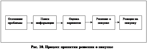 На рис. 9 эта же модель представлена в более развернутом виде. В левом прямоугольнике - побудительные факторы двух типов. Побудительные факторы маркетинга включают в себя четыре элемента: товар, цену, методы распространения и стимулирования. Прочие раздражители слагаются из основных сил и событий из окружения покупателя; экономической, научно-технической, политической и культурной среды. Пройдя через "черный ящик" сознания покупателя, все эти раздражители вызывают ряд поддающихся наблюдению покупательских реакций, представленных в правом прямоугольнике: выбор товара, выбор марки, выбор дилера, выбор времени покупки, выбор объема покупки. Задача деятеля рынка - понять, что происходит в "черном ящике" сознания потребителя между поступлением раздражителей и проявлением откликов на них. Сам "черный ящик" состоит из двух частей. Первая - характеристики покупателя, оказывающие основное влияние на то, как человек воспринимает раздражители и реагирует на них. Вторая часть - процесс принятия покупательского решения, от которого зависит результат. Теперь необходимо рассмотреть этапы, которые покупатель преодолевает на пути к принятию решения о покупке и ее совершению. На рис. 10 представлены пять этапов, через которые проходит потребитель. Из этой модели следует, что процесс покупки начинается задолго до совершения акта купли-продажи, а ее последствия проявляются в течение долго времени после совершения этого акта.