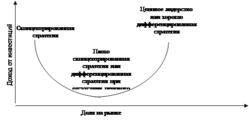 IV.3 . Программа воздействия рыночной стратегии на прибыль Программа воздействия рыночной стратегии на прибыль ( PIMS) , осуществляемая Институтом стратегического планирования, предполагает сбор данных от ряда корпораций для того, чтобы установить взаимосвязь между различными экономическими параметрами и двумя характеристиками функционирования организации: доходом от инвестиций и движением наличных средств. Информация собирается подразделениями и агрегируется по отраслям. Анализируя общие данные по отрасли, организация может определить воздействие различных маркетинговых стратегий на функционирование. Согласно результатам 1983 г. в США на доход сильнее всего влияли следующие факторы, связанные с маркетингом: доля на рынке относительно трех ведущих конкурентов; стоимость, добавленная компанией; рост отрасли; качество продукции; уровень инновации/дифференциации и вертикальная интеграция (обладание последующими каналами сбыта). Что касается движения денежных средств, данные PIMS говорят о том, что растущие рынки требуют от компании средств, относительная высокая доля на рынке улучшает поступление денег, а высокие уровни инвестиций поглощают деньги. Эти выводы весьма схожи с результатами, которые дает матрица "Бостон консалтинг груп". Информация направляется участвующим компаниям в следующих формах: стандартные сообщения - информация о среднем доходе от инвестиций, конкуренции, технологии и структуре издержек; сообщения по анализу стратегий - описание воздействия изменений в стратегии на кратко- и долгосрочный доход от инвестиций и движение наличных средств; сообщения об оптимальных стратегиях - изложение стратегии, максимизирующей результаты; сравнительные сообщения - анализ тактики схожих конкурентов, как удачливых, так и неудачливых. IV.4 . Общая стратегическая модель Портера Общая стратегическая модель Портера рассматривает две основные концепции планирования маркетинга и альтернативы, присущие каждой из них: выбор целевого рынка (в рамках всей отрасли или отдельных сегментов) и стратегическое преимущество (уникальность или цена). Объединяя эти две концепции, модель Портера идентифицирует следующие базовые стратегии: преимущество по издержкам, дифференциация и концентрация. Используя стратегию преимущества по издержкам, фирма ориентируется на широкий рынок и производит товары в большом количестве. При помощи массового производства она может минимизировать удельные издержки и предлагать низкие цены. Это позволяет иметь более высокую долю прибыли по сравнению с конкурентами, лучше реагировать на рост себестоимости и привлекать потребителей, ориентирующихся на уровень цен. Используя стратегию дифференциации, фирма нацеливается на большой рынок, предлагая товар, который рассматривается как выделяющийся. Компания выпускает привлекательный для многих товар, который тем не менее рассматривается потребителями как уникальный в силу его дизайна, характеристик, доступности, надежности и т. д. В результате цена не играет столь важной роли, и потребители приобретают достаточную лояльность к товарной марке. В рамках стратегии концентрации компания выделяет специфический сегмент рынка через низкие цены или уникальное предложение. Она может контролировать издержки посредством концентрации усилий на неско