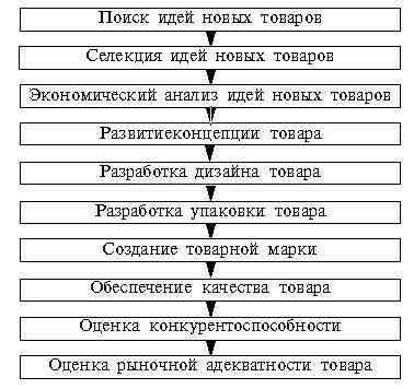 Рисунок 1. Общая схема разработки нового товара Поиск идей новых товаров Основные составляющие процесса поиска идей новых товаров – это анализ источников идей и применение творческих методов получения идей [3]. Можно выделить три основных источника идей для создания новых продуктов. 1. Важнейший – это рынок , причем импульсы могут исходить как от потребителей, так и от конкурентов. Желания клиентов, рекламации, типичные причины ремонта дают важную информацию для улучшения продуктов. Потребительские организации постоянно требуют от предприятий улучшения продукции и указывают на возможности в этой области. 2. Второй источник – это само предприятие, т.е. в первую очередь, все сотрудники фирмы, которые заинтересованы в выпуске более современного и, соответственно, более рентабельного товара, во вторую очередь, работники исследовательских подразделений предприятия, призванные заниматься именно разработкой новых товаров. Развитие новых продуктов лишь в редких случаях возможно без интенсивных исследований. Крупные предприятия имеют существенные преимущества в этой области. Таким образом, ограничивается конкуренция, поскольку вступление новых предприятий на рынок затрудняется. Для того чтобы выстоять в этих условиях, средние фирмы могут кооперироваться для совместного проведения исследований. 3. Третий источник для выработки идей – независимые фирмы , которые тоже могут быть привлечены для поиска идей новых товаров. Существенное значение имеют отчеты институтов, занимающихся исследованием товаров. На выставках и ярмарках могут быть проанализированы отечественные и зарубежные конкурентные продукты, следует также привлечь анализ патентов и результатов исследований в родственных областях. Если анализ источников идей не дает желаемых результатов, то можно использовать творческие методы генерации идей новых товаров, к которым относятся: морфологический и проблемный методы анализа, мозговая атака и синектический подход. Синектический подход заключается в постепенном отчуждении исходной проблемы путем построения аналогий с другими областями жизни. После многоступенчатых аналогий производится быстрый возврат к исходной задач. Генерированные идеи следует оценить и выбрать из них наиболее оптимальные для деятельности фирмы. Подобный этап получил название селекции идей. Селекция идей новых товаров Цель предварительной селекции идей заключается в возможно раннем выделении непригодных решений. Оцениваются не продукты, а идеи в их более или менее зачаточной форме. Предварительная селекция может означать проверку идей на их соответствиетребованиям фирмы, которое может включать экспертные оценки, матрицу оценки и многокритериальную оценку.Для этого используют собственных специалистов предприятия. Критерии оценки зависят от характера предприятия. Экспертная оценка проводится, прежде всего, по таким показателям как ожидаемый объем продаж, рост производства, достижимая степень проникновения, соответствие продукта используемым или планируемым каналам распределения. Необходимо выяснить, какие преимущества имеет продукт по отношению к конкурентам, есть ли правовые или моральные проблемы. Эксперты должны оценить, насколько реализуема идея с финансовой и технической точек зрения и насколько она соответствует 