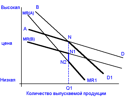 Повышение цен не является примером для фирмы В, следовательно, график спроса в условиях рынка олигополии имеет вид изогнутой кривой ND1. Если фирма не соглашается с повышением цен, то график предельного дохода соответствует отрезку MRN1. Если фирма снижает цены, как и конкурент, то график предельного дохода соответствует отрезку N2MR1. Из-за различий в эластичности спроса график предельного дохода имеет разрыв N1N2 при одном объёме производства, следовательно, снижение цены не может быть компенсировано расширением объёма производства. Модель изогнутой кривой подтверждает, почему фирма в условиях рынка олигополии с осторожностью относится к изменению цен на свою продукцию и стремится к поддержанию стабильных цен, не переводя конкурентную борьбу в ценовую область. При чистой монополии на рынке всего один продавец. Это может быть государственная организация, частная регулируемая монополия, частная нерегулируемая монополия. В каждом отдельном случае ценообразование складывается по-разному. Государственная монополия может с помощью политики цен преследовать достижение самых разных целей. Она может установить цену ниже себестоимости, если товар имеет важное значение для покупателей, которые не в состоянии приобретать его за полную стоимость. Цена может назначена с расчётом на покрытие издержек или получение хороших доходов. А может быть и так, что цена назначается очень высокой для всемерного сокращения потреблений. В случае регулируемой монополии государство разрешает компании устанавливать расценки, обеспечивающие получение «справедливой нормы прибыли», которая даст организации возможность поддерживать производство, а при необходимости и расширить его. И наоборот, в случае нерегулируемой монополии фирма сама вольна устанавливать любую цену, которую только выдержит рынок. И тем не менее по ряду причин фирмы не всегда запрашивают максимально возможную цену. Тут и боязнь введения государственного регулирования, и нежелание привлекать конкурентов, и стремление быстрее проникнуть на всю глубину рынка благодаря невысоким ценам. В отличии от чистой конкуренции (где существует два графика спроса) на рынке чистой монополии существует один график , в виде наклонной линии, который одновременно является графиком спроса фирмы монополиста и графиком рыночного спроса. Существует два следствия нисходящего графика рынка чистой монополии. · – цена на продукцию превышает предельный доход; · – кто диктует цены.