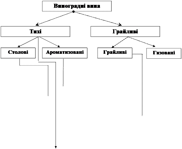 · За вмістом вуглекислоти усі виноградні вина поділяються на дві категорії: тихі (не містять вуглекислого газу) і насичені вуглекислотою – грайливі. Товарознавча класифікація виноградних вин показана на рис. 1.1. З рис. 1.1 видно, що в залежності від технології виготовлення тихі виноградні вина поділяють на три категорії: столові, кріплені й ароматизовані. Тип вина включає окремі марки , що мають певні найменування . Столові виноградні вина бувають сухі і напівсолодкі. Сухі вина одержують внаслідок повного шумування свіжого виноградного сусла з мезгою чи без неї. Вони являють собою сік винограду, що перебродив і не має ніяких домішок. На Україні виробляють такі типи вина цієї групи: столове біле, столове рожеве, столове червоне і херес столовий[5;42]. Херес столовий виготовляють як біле виноградне вино, але для надання йому специфічного запаху і смаку ще витримують під плівками спеціальних дріжджів - солера. При виготовленні Хересу використовуються спеціальні хересні раси дріжджів, здатні утворювати на поверхні вина, у неповних бочках, плівку. При витримці вина під плівкою хересних дріжджів, в аеробних умовах, у процесі їх життєдіяльності відбуваються значні зміни хімічного складу вин[5]. Столові білі вина мають колір від світло-солом'яного до темно-золотавого; рожеві - від яскраво-рожевого до яскраво-червоного; червоні - від ясно-червоного до темно-червоного і херес - від світло-золотавого до темно-золотистого. До кращих столових сухих виноградних вин варто віднести: Марочні білі - алиготе "Ай-Даниль" і "Золота балка", рислінг "Алькадар", "Сильванер феодосійський", "Кокур сейтлерський", "Перлина степу", "Наддніпрянське", "Ужгородське", "Шабське", "Променисте", "Берегівське".Марочні червоні - "Алушта", бордо "Ай-Даніль", "Оксамит України". Ординарні білі виноградні вина - "Столове біле", "Біле кримське", "Рислінг", "Сильванер". Ординарні червоні виноградні вина - "Столове" рожеве і червоне, "Червоне кримське", "Червоне дніпровське", "Червоне гібридне". Столові напівсолодкі виноградні вина на Україні не виготовляються. Такі вина бувають білі, рожеві і червоні. При їхньому виробництві сусло бродиться не повністю, внаслідок чого вони містять від 3 до 8% цукру і 10-14% спирту. У продаж найбільше часто надходять ординарні напівсолодкі вина Болгарії (Колекція болгарських вин), Вірменії ("Айгестан", "Миличка", "Вскеваз білий") чи Грузії ("Чхавери",