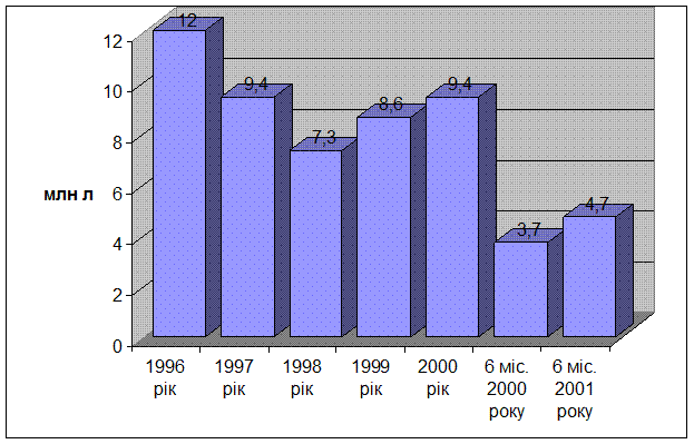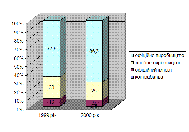 Рис. 3.1 Виробництво виноградних вин в Україні в 1996 – 2001 роках З рис.3.1 видно, що з 1996 року відбувалося зменшення ринку виноградного вина в Україні на 2,4 млн.л, а починаючи з 1998 року спостерігається збільшення виробництва на 10%, і в 2000 році його об”єм на ринку досягнув 9,4 млн.л. Ряд формувань і підприємств зуміли забезпечити зростання виноробної продукції. Це Інкерманський завод марочних вин, радгосп-завод „Коктебель” та „Білозерський”, агрокомбінат „Тарасівський”, ВАТ „Чорна перлина” та „Новоукраїнський” та інші виноробні підприємсва (більше 600 виробників). Основними джерелами поступлення виноградного вина на ринок України являється його офіційне (80-90%) та тіньове (25-30%) виробництво, а також імпорт та контрабанда (рис 3.2) [14;48].