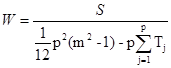 называемое коэффициентом конкордации. Величина W изменяется в пределах от 0 до 1. При W = 0 согласованности совершенно нет, т.е. связь между оценками различных экспертов отсутствует. Наоборот, при W = 1 согласованность мнений экспертов полная. В том случае, если последовательность (2) кроме строгих неравенств имеет равенства, т.е. существует совпадение рангов, то формула для вычисления коэффициента конкордации имеет вид