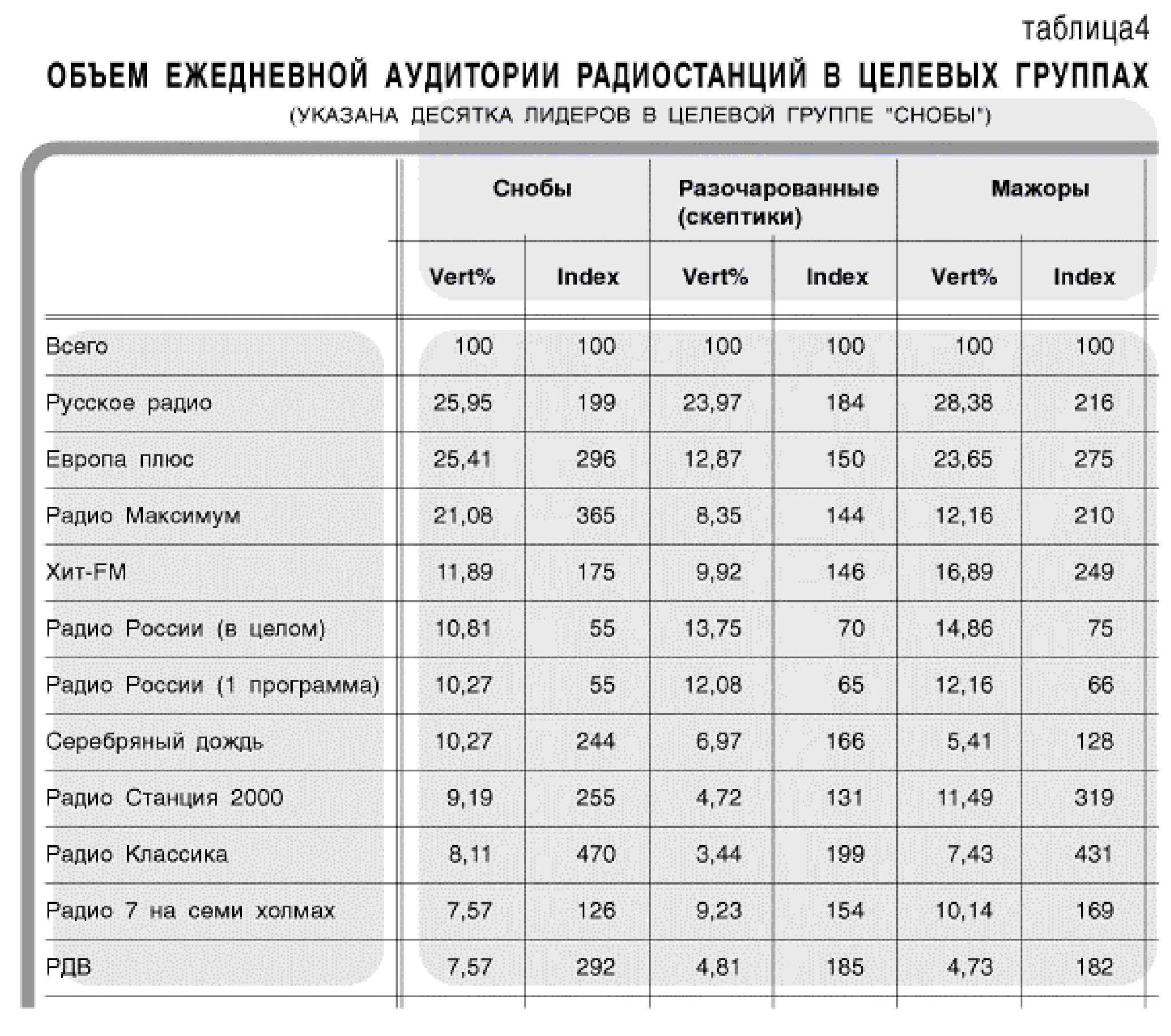 Отношение кластеров к рекламе может быть выражено цифрами с помощью индекса лояльности. Таблица 1.