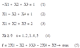 Система (4) – естественные ограничения и в таблицу не вписываются. Уравнения (1), (2), (3) образуют область допустимых решений. Выражение (5) – целевая функция. Свободные члены в системе ограничений и области допустимых решений должны быть неотрицательны. В данном примере X3, X4, X5 – базисные неизвестные. Их надо выразить через свободные неизвестные и произвести их замену в целевой функции.