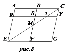 Кавальери доказал теорему: Сумма квадратов неделимых параллелограмма втрое больше суммы квадратов неделимых треугольника, образованного в результате проведения диагонали (рис. 8). Введём для краткости обозначения: АС = а , RT = x, TV = y, RS = а /2 = в, ST = z . Тогда х = в + z , у = в – z и сумма квадратов частей неделимых х 2 + у 2 = 2в 2 + 2z 2 . Суммируем все неделимые, обозначив сумму квадратов неделимых символом [ ]: [AEC] + [CGE] = 2[ABFE] + 2[BCM] + 2[FEM]. Заметим, что [AEC] = [CGE]; [ABFE] = 1/4[ACGE]; [BCM] = [FEM] = 1/8[ACE], что нетрудно понять, вообразив над каждым линейным элементом квадрат и рассматривая их совокупности. Следовательно, [ACE] = 1/4[ACGE] + 1/8[ACE] + 1/8[ACE]; [ACE] = 1/3[ACGE].