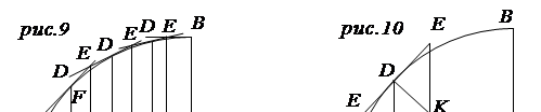 Сумма синусов какой–нибудь дуги (BF) четверти круга (рис. 9) равна отрезку основания (АО) между крайними синусами, умноженному на радиус (АВ). Дуга BF делится на равные части, отмеченные точками из которых из которых проводятся синусы DI. Точки пересечения касательных к дуге окружности в точках в обозначены точками Е; из последних затем опускаются перпендикуляры ER. Предварительно Паскаль указывает, что DI . EE = RR . AB (1) Действительно (рис. 10), из подобных прямоугольников DIA и EKE (ÐЕЕК = ÐDAI) следует: AD/DI = EE/EK Ввиду того, что AB = AD, получаем равенство (1). «Я утверждаю, — пишет после этого Паскаль, — что сумма синусов DI каждого умноженного на одну из равных дуг DD, равна прямой АО умноженной на радиус АВ». Заменяя каждую касательную ЕЕ дугой DD, Паскаль получает в левой части равенства (1) «сумму синусов», а в правой произведение АВ на сумму отрезков RR, то есть, на АО. Итак, теорема доказана. Отождествление дуги DD с отрезком касательной Паскаль только подразумевает. Чтобы перевести доказательство Паскаля на современный язык введём соответствующую систему декартовых координат, обозначим «синус DI» через у, элемент дуги DD – через ds, дифференциал независимого переменного – через dх, радиус АВ – через r. Тогда равенство (1) можно записать так: уds = rdх