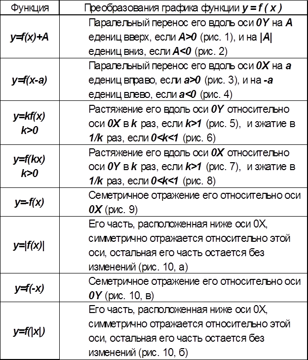 §2. Построение графика функций с помощью преобразования Во многих случаях графики функций могут быть построены путем некоторых преобразований уже известных графиков других функций более простого вида. График функций вида: y=Af( a x+b)+B может быть получен из графика функций y=f(x) при помощи следующих геометрических преобразований: 1. а) Осевой симметрии относительно оси 0 X; б) осевой симметрии относительно оси0Y; в)центральной симметрии относительно начала координат точки0; 2. а) Параллельного переноса (сдвига) вдоль оси 0X ; б) параллельного переноса (сдвига) вдоль оси 0Y ; 3. а) Растяжения (или сжатия) по направлению оси 0X ; б) растяжения (или сжатия) по направлению оси 0 Y; Отметим, что: 1. а) При осевой симметрии относительно оси 0X точка ( x; y ) переходит в точку ( x; -y ) ; б) При осевой симметрии относительно оси 0Y точка ( x; y ) переходит в точку ( -x; y ) ; в) При центральной симметрии относительно начала координат ( x; y) переходит в точку ( -x; -y ) ; 2. а) При параллельном переносе вдоль оси 0X точка ( x; y) переходит в точку ( x+a; y) , где а – некоторое число при этом перенос происходит «вправо», если а > 0 , и «влево», если а < 0 ; б) ) При параллельном переносе вдоль оси 0Y точка ( x; y) переходит в точку ( x; y+b) , где b – некоторое число при этом перенос происходит «вверх», если b > 0 , и «вниз», если b< 0 ; 3. а) При растяжении (сжатии) в p раз ( p>0, p ¹ 1) вдоль оси 0X относительно 0Y точка( x; y) переходит в точку( px; y); б)При растяжении (сжатии) в q раз ( q>0, q ¹ 1) вдоль оси 0Y относительно 0X точка( x; y) переходит в точку( x; qy); Применительно к графикам функций эти свойства дают те конкретные геометрические преобразования (табл. 1), использование которых позволяет из известного графика функции y=f(x ) строить графики других функций (рис. 1 - 11). Таблица №1
