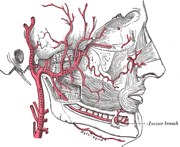 Рис.4 Ветви верхнечелюстной артерии От верхнечелюстной артерии в пределах ее челюстного отдела отходят: 1) глубокая ушная артерия, а. auriculdrisprofunda, к височно-нижнечелюстному суставу, наружному слуховому проходу и барабанной перепонке; 2) передняя барабанная артерия , а. tympdnicaanterior, которая через каменисто-барабанную щель височной кости следует к слизистой оболочке барабанной полости; 3) относительно крупная нижняя альвеолярная артерия , а. alveolarisinferior, вступающая в канал нижней челюсти и отдающая на своем пути зубные ветви , rr. dentales. Эта артерия покидает канал через подбородочное отверстие как подбородочная артерия , а. mentalis, которая ветвится в мимических мышцах и в коже подбородка. До входа в канал от нижней альвеолярной артерии ответвляется тонкая челюстно-подъязычная ветьвь, r. mylohyoideus, к одноименной мышце и переднему брюшку двубрюшной мышцы; 4) средняя менингеальная артерия , а. meningea, - наиболее значительная из всех артерий, питающих твердую оболочку о мозга. Проникает в полость черепа через остистое отверстие большого крыла клиновидной кости, отдает там верхнюю барабанную артерию , а. tympanicasuperior, к слизистой оболочке барабанной полости, лобную и теменную ветви , rr. frontarietalits , к твердой оболочке головного мозга. До входа в остистое отверстие от средней менингеальной артерии отходит менингеальная добавочная ветвь , г. meningeusaccessorius (r. accessories), которая вначале, до входа в полость черепа, кровотснабжает крыловидные мышцы и слуховую трубу, а затем, пройдя через овальное отверстие внутрь черепа, посылает ветви к твердой оболочке головного мозга и к тройничному узлу. В пределах крыловидного отдела от верхнечелюстной артерии отходят ветви, питающие жевательные мышцы: 1) жевательная артерия, а. masseterica, к одноименной мышце; 2) височная глубокая [передняя ] и (височная задняя) артерии , а. temporalisprofunda (anterior) и (а. temporalisposterior), уходящие в толщу височной мышцы; 3) крыловидные ветви , rr. pterygoidei, к одноименным мышцам; 4) щечная артерия , а. buccalis, к щечной мышце и к слизистой оболочке щеки; 5) задняя верхняя альвеолярная артерия , а. alveolarissuperiorposterior, которая через одноименные отверстия в бугре верхней челюсти проникает в верхнечелюстную пазуху и кровоснабжает ее слизистую оболочку, а ее зубные ветви , rr. dentales,— зубы и десны верхней челюсти. От третьего - крыловидно-небного - отдела верхнечелюстной артерии отходят три конечные ветви: 1) подглазничная артерия , a. infraorbitalis, которая проходит в глазницу через нижнюю щель, где отдает ветви к нижним прямой и косой мышцам глаза. Затем через подглазничное отверстие эта артерия через одноименный канал на лицо и кровоснабжает мимические мышцы, расположенные в толще верхней губы, в области носа и нижнего века, и покрывающую их кожу. Здесь подглазничная артерия анастомозирует с ветвями лицевой и поверхностной височной артерий. В по.глазничном канале от подглазничной артерии отходят передние верхние альвеолярные артерии ,аa. alveolares superiores anteriores, отдающие зубные ветви , rr. dentales, к зубам верхней челюсти; 2) нисходящая небная артерия , а. palatina descendens, - тонкий сосуд, который, отдав в начале артерию крыловидного канала , а. canalis pterygoidei, к верхней части глотки и слуховой трубе и пройдя через большой небный канал, кровоснабжает твердое и мягкое небо (aa. palatinae major et minores), анастомозирует с ветвями восходящей небной артерии; 3) клиновидно-небная артерия , а. spheno