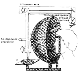 Рис. 12 Схема рефракции в дальнозорком (1), нормальном (2) и близоруком (3) глазу щечные волокна. При их сокращении тяга связок ослабляется, а значит, уменьшается давление на хрусталик, который вследствие своей эластичности принимает более выпуклую форму. Сокращение мышц регулируется парасимпатической и симпатической частями вегетативной нервной системы. Нарушение преломления лучей выступает в двух формах - близорукости (миопии) и дальнозоркости (гиперметропии). Близорукость может быть обусловлена или большой длиной глазного яблока, или повышенной преломляющей способностью хрусталика. В этом случае главный фокус преломления будет располагаться не на сетчатке, а перед ней. Дальнозоркость объясняется или уменьшением преломляющей силы хрусталика, или уменьшением величины глазного яблока. В этих случаях фокус будет находиться за сетчаткой. Помимо перечисленных выше дефектов оптической системы глаза могут происходить изменения внутреннего состава хрусталика и стекловидного тела, ведущие к их помутнению. Поэтому при преломлении света наблюдается его диффузное рассеивание. При рассмотрении белого фона поверхности человек видит мелькающие кружочки, точки и т. д. 2.4 Зрительное восприятие 2.4.1 Поля зрения Если фиксировать глазом какую-либо точку, ее изображение падает на желтое пятно. И в этом случае мы видим точку центральным зрением. Точки, изображение которых падает на остальные области сетчатки, видимы периферическим зрением. Совокупность точек, одновременно видимых глазом при фиксации взгляда в одной точке, называют полем зрения. Измерение границы поля периферического зрения производят прибором, называемым периметром. Граница поля зрения для бесцветных предметов составляет книзу 70", кверху - 60° и кнаружи - 90°. Поля зрения для различных цветов неодинаковы, больше всего они для бесцветных предметов. Рис.13Схема аппарата для периметрии. Поле зрения оценивается монокулярно. Испытуемый располагается перед аппаратом таким образом, что его глаз совпадает с центром полусферы и фиксирует взглядом точку на ее полюсе (Ф). Врач проверяет правильность фиксации через специальное отверстие и перемещает световое пятно по поверхности сферы прибора с помощью проекционной системы, управляемой ручкой Р. Световое пятно может иметь разную величину, яркость и цвет. Как только испытуемый замечает пятно, он подает сигнал, и это положение пятна регистрируется на бумаге, закрепленной на подставке П. А Результат определения границ нормального поля зрения для белого, синего и красного стимулов. СП - слепое пятно. Точка фиксации соответствует центру концентрических кругов, обозначающих удаленность стимула от точки фиксации (в угловых градусах). 2.4.2 Оценка расстояния Восприятие глубины и оценка расстояния возможны как при зрении одним глазом (монокулярное зрение), так и двумя глазами (бинокулярное зрение). При бинокулярном зрении оценка расстояния происходит точнее. 2.4.3 Цветовое восприятие Восприятие цвета колбочками связано с наличием трех их типов, которые соответственно реагируют на синий, зеленый и красный цвета. Промежуточные цвета воспринимаются при одновременном возбуждении колбочек двух типов и более. Отсутствие различения отдельных цветов называется частичной цветовой слепотой. Нарушение цветовосприятия называется дальтонизмом