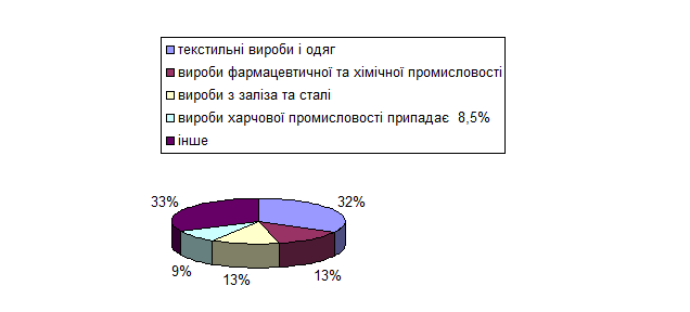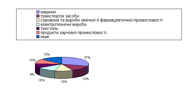 Перше місце посідають машини (27%), друге - транспортні засоби (12%), далі —сировина та вироби хімічної й фармацевтичної промисловості (10%), електротехнічні вироби (10%) і текстиль (9%) На продукти харчової промисловості припадає 10% . [15] На сьогодні Україна стала одним з найбільших торгівельних
