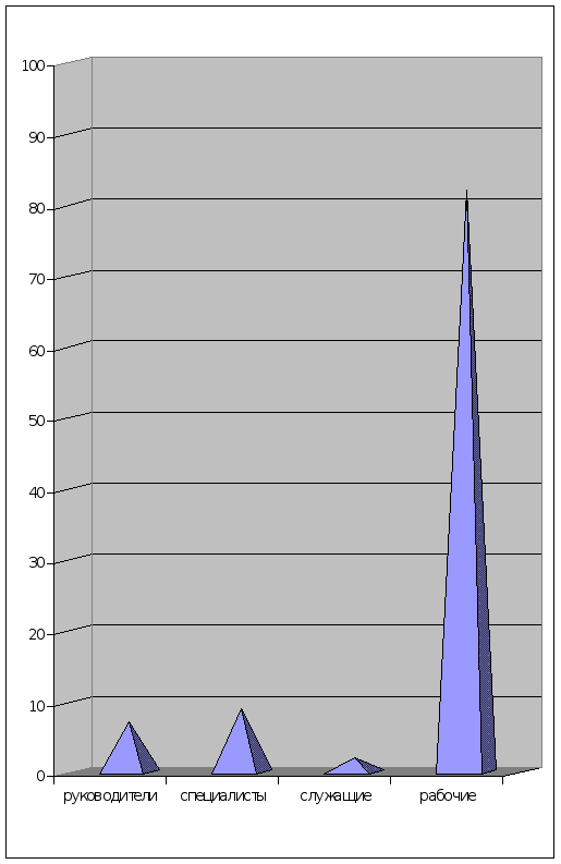 руководители - 7% специалисты - 9% служащие - 2% рабочие – всего - 82% (рис.5.4.3) Генеральный директор - руководит всеми видами деятельности предприятия. Организует работу и эффективное взаимодействие производственных единиц, цехов и других структурных подразделений предприятия, направляет их деятельность на достижение высоких темпов развития и совершенствование производства; повышение производительности труда, эффективности производства и качества продукции на основе широкого внедрения новой техники, научной организации труда, производства и управления. Принимает меры по обеспечению предприятия квалифицированными кадрами, по наилучшему использованию знаний и опыта работников, созданию безопасных и благоприятных условий для их труда. Директор должен знать: постановления, распоряжения, приказы, другие руководящие и нормативные материалы вышестоящих органов, касающиеся деятельности предприятия; профиль, специализацию и особенности структуры предприятия; технологию производства продукции комбината; методы хозяйствования и управления предприятием. Квалификационный уровень: высшее техническое образование и стаж работы на руководящих должностях в соответствующей профилю предприятия отрасли экономики не менее 5 лет.