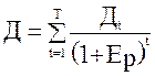 где JR – индекс рентабельности Дj – доход в периоде j Kt – размер инвестиций в инновации в периоде t. Приведенная формула отражает в числителе величину доходов, приведенных к моменту начала реализации инноваций, а в знаменателе - величину инвестиций в инновации, продисконтированных к моменту начала процесса инвестирования. Или иначе можно сказать – здесь сравниваются две части потока платежей: доходная и инвестиционная. Индекс рентабельности тесно связан с интегральным эффектом, если интегральный эффект Эинт положителен, то индекс рентабельности JR > 1, и наоборот. При JR > 1 инновационный проект считается экономически эффективным. В противном случае JR < 1 – неэффективен. Предпочтение в условиях жесткого дефицита средств должно отдаваться тем инновационным решениям, для которых наиболее высок индекс рентабельности. 2.1.3. Норма рентабельности Норма рентабельности Ер представляет собой ту норму дисконта, при которой величина дисконтированных доходов за определенное число лет становится равной инновационным вложениям. В этом случае доходы и затраты инновационного проекта определяются путем приведения к расчетному моменту времени.
