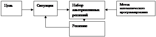 Рис. 7. Варианты использования статистических методов: а) на стадии разработки УР, б) на стадии выбора окончательного УР На стадии разработки после выработки предварительного решения оно обсуждается с коллегами своего или родственного предприятия для учета их положительного опыта (фильтр). Затем принимается окончательное решение. Например, работники бухгалтерии разных организаций часто консультируются друг с другом, прежде чем окончательно оформить набор документов для отчета в налоговой инспекции; руководители многих компаний периодически собираются вместе для обсуждения опыта работы, используя для этого различные поводы: рыбалку, охоту и др. На стадии выбора окончательного УР у работников предприятия уже имеется в наличии (в ЭВМ или в виде различных картотек) постоянно пополняемый набор УР. На самой начальной стадии разработки решений работники используют положительный опыт других организаций и принимают с учетом его окончательное УР. Затем это новое решение с результатами выполнения также войдет в набор УР. Метод математического программированияЭтот метод позволяет рассчитывать лучший вариант решения по критериям оптимальности (например, минимум времени, максимум качества и др.) программы действий УР (рис. 8.). Критерии