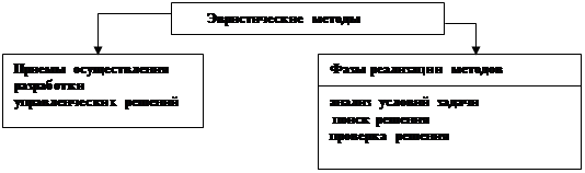 Окончательный выбор Для осуществления парных сравнений по приведенной схеме УР записываются подряд в любом порядке. Затем эксперты сравнивают два первых УР, лучшее из них сравнивается с третьим УР и т.д. В результате парных сравнений выбирается одно лучшее УР. 3.5. Эвристические методы Основы эвристические методов Эвристические методы основаны на логике, здравом смысле и опыте при РУР, при которых выявляется новая существенная информация. Они используют метод Сократа — извлекать скрытую в человеке информацию с помощью искусных наводящих вопросов. Методы применяются при недоступности или отсутствии условий для использования формализованных методов РУР. Основу эвристических методов составляет метод индукции, т.е. переход от частного к общему. При этом проблема разделяется на несколько относительно простых подпроблем. Для каждой подпроблемы формируются набор задач и набор соответствующих решений. Считается, что при успешном выполнении всех решений проблема будет разрешена в целом. Данные методы j практически целиком относятся к искусству в управленческой деятельности. .Эти методы эффективны, если руководитель смог так разделить проблему, что получившиеся подпроблемы являются типовыми (штатными) для конкретной компании и имеется типовая методика их реализации. Разработка управленческих решений для нетиповых, обычно творческих задач — довольно трудное занятие. В управленческой практике таких задач встречается довольно много. Это связано с новыми условиями, в которые попадает человек или коллектив в производственной деятельности. Обычно такие задачи решаются постепенно путем обсуждения, концентрации идей, развития новых подходов и стимулирования мышления. Неслучайно собрания, заседания, летучки, планерки и другие формы проведения обсуждения новых проблем и разработки решений прочно вошли в практику работы руководителей. На подобных мероприятиях руководители и специалисты принимают такие эффективные решения, которые не под силу одному даже очень умному человеку. Подавляющее большинство открытий и изобретений сделано при коллективном обсуждении или с их подачи, а известные слова: «эврика» и «эвристика» дали название этим методам. Собрания и совещания можно проводить двумя способами: без подготовки и с подготовкой. Без подготовки такие мероприятия малоэффективны и не дают удовлетворения их участникам. Часто работники с большой неохотой идут на собрания и совещания. Известен закон Паркинсона о том, что эффективность совещания обратно пропорциональна затраченному времени и количеству приглашенных людей. Подготовленные собрания основаны на различных методах, в том числе и на эвристических. Эвристика состоит в последовательном выделении целей и ситуации, а также в уменьшении их различий. Характерные наборы приемов эвристических методов В специальной литературе рассматривается около тридцати наборов приемов эвристических методов. Приведу два из них: Набор 1 · Обобщение задачи · Конкретизация задачи · Формулирование обратной задачи · Включение в другую структуру · Критика очевидных решений · Поиск привнесенных условий · Движение от конца к началу · Сближение данных и цели · Перекодирование текста в модель · Использование сходных задач Рассмотрение с различных сторон · Анализ условий Анализ конфлик