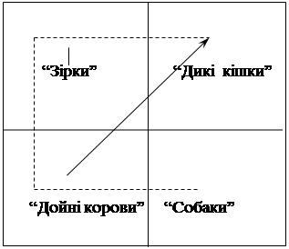 Рис. 1.2. Процес виділення СЗГ.[32, с. 184] Як видно з малюнку, процес виділення СЗГ починається з визначення потреб потенційних споживачів продукції. В залежності від характеру засобів задоволення цих потреб досліджують можливі технологічні рішення пов'язані з виробництвом цих засобів. На основі аналізу засобів задоволення потреб і технології їх виробництва прогнозують можливий тип клієнта (покупця), що може в перспективі придбати такі засоби по ціні, зумовленій витратами виробництва по даній технології виявлених засобів задоволення потреби. Після цього визначають географічний регіон, в якому можуть концентруватися більшість потенційних клієнтів. Шляхом аналізу зазначених чинників визначають, які з них можуть забезпечити успіх підприємства в даній СЗГ. В ході аналізу досліджують чинники, які безпосередньо впливають на конкретні значення кожного параметру СЗГ. Ключовою задачею стратегічного аналізу є внесення до набору СЗГ нових зон, і відокремлення тих, які більше не відповідають параметрам стратегії зростання підприємства. Для порівняння різноманітних СЗГ застосовують різні підходи. Одним з них є підхід, запропонований Бостонською консультативною групою (БКГ) США. Його суть полягає у визначенні за допомогою матриці співвідношення зростання обсягу попиту і показника, що характеризує відношення частки ринку, що належить підприємству, до частки ринку, що належить її ведучому конкуренту (рис.1.3.). Це співвідношення визначає порівняльні конкурентні позиції підприємства в перспективі. Для кожної СЗГ робиться оцінка наведених двох параметрів, що вписуються в відповідні клітинки.