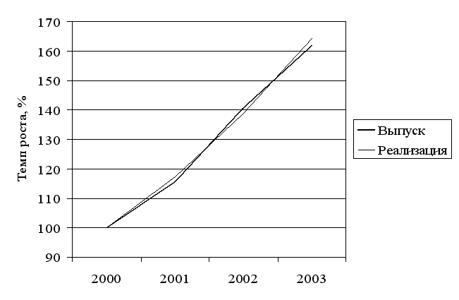Из таблицы видно, что за четыре года объем производства вырос на 62 %, а объем реализации продукции увеличился на 64,3 %. То, что за 2003 год темп производства продукции ниже темпа реализации, говорит о том, что нереализованная продукция на складах предприятия и неоплаченная покупателями за предыдущий период реализована в 2003 году полностью. Среднегодовой темп роста (прироста) выпуска и реализации продукции можно рассчитать по среднегеометрической взвешенной: