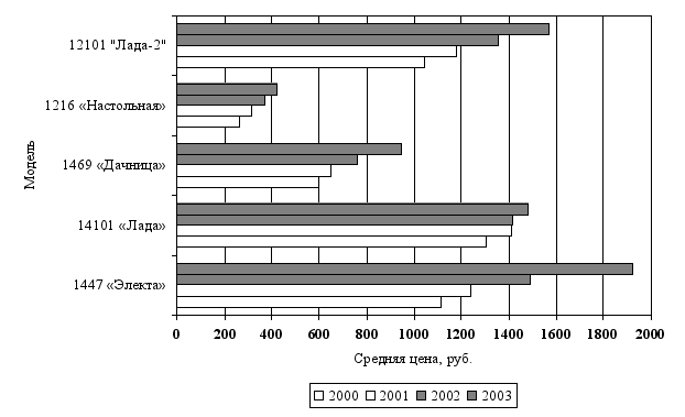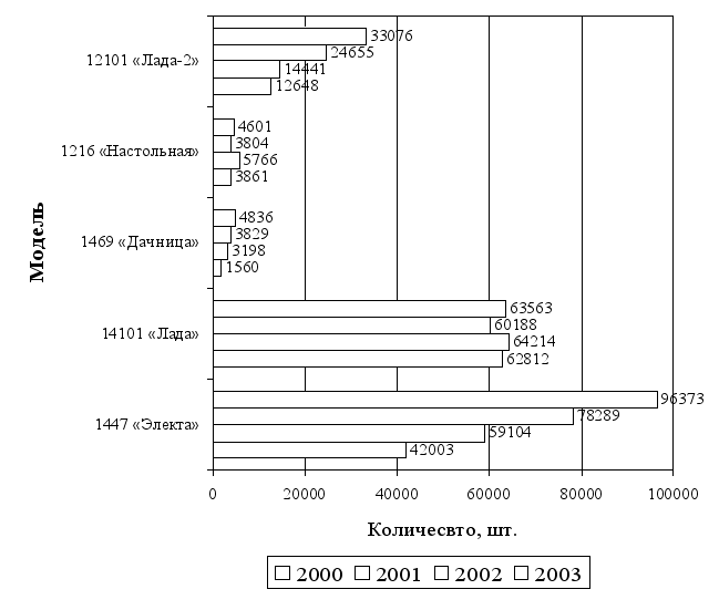Также стоит рассмотреть изменение объемов продаж отдельных видов продукции по годам. Таблица 2.3 – Объем продаж по видам продукции за 2000 – 2003 гг.