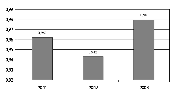 Рисунок 2.7 - Коэффициент постоянства персонала предприятия В первую очередь бросается в глаза то, что все анализируемые года предприятие работало с недостачей персонала около 2%. Это явилось результатом непродуманной кадровой политики предприятия, а зачастую было вызвано искусственно самим персоналом, так как возможность выполнить больший объем работ позволяла и больше зарабатывать. Этот факт говорит о том, что плановое количество персонала завышено, ввиду ошибочного нормирования производственных показателей работы рабочих и служащих. Вывод об этом можно сделать ввиду того, что у каждого рабочего существенная переработка, хотя это в основном результат других причин. Справедливости ради нужно сказать, что основная недостача численности персонала складывается по статье «Служащие», а это говорит об необоснованном раздувании штатов управленческого звена, свидетельствует о необходимости пересмотра штатных расписаний в сторону уменьшения численности. Нужно отметить наметившуюся тенденцию к стабилизации кадрового состава и отсеиванию случайных людей, об этом свидетельствует коэффициент постоянства персонала предприятия, увеличившийся на 0,037. После ознаменовавшегося сильными кадровыми переменами 2002 года, в 2003 году достигнута стабилизация по всем показателям: коэффициент оборота по выбытию уменьшился на 0,037, а коэффициент текучести кадров на 0,03. Резкое падение коэффициента оборота по приему персонала явилось результатом освоения больших производственных мощностей в 2002 году, чем 2003 год к сожалению похвастаться не может. Важно также отметить, что руководство предприятия сделало выводы из волны увольнений прокатившейся в 2002 году (а основную часть уволившихся составляли именно опытные специалисты, работающие с основания предприятия и уставшие от пустых обещаний и работы на голом энтузиазме), рост числа уволившихся произошел более чем в 1,5 раза, провело в жизнь ряд изменений, коснувшихся в первую очередь совершенствования условий и системы оплаты труда. Как результат - снижение числа уволившихся почти в 2,5 раза. 2.3.2 Использование трудовых ресурсов Полноту использования трудовых ресурсов можно оценить по количеству отработанных часов одним работником за анализируемый период времени, а также по степени использования фонда рабочего времени, соответствующие данные представлены в таблице 2.6. В первую очередь нужно отметить наметившуюся тревожную тенденцию роста числа отработанных дней одним рабочим, как по сравнению с предыдущим годом так и с планом, в 2001 году рост составил 1 день, в 2002 - 3, а в 2003 году аж 18 дней. Вызвано это в первую очередь значительны превышением фактического выпуска над плановым, в 2001 году на 20,45 млн. руб., в 2002 году на 21,07 млн. руб., а 2003 году уже на 27,9 млн. руб. Хочется заметить, что рост объемов производства дается непросто, несмотря на высокую (превышающую плановую) интенсивность труда рабочих сверхурочно отработанное время составило в 2001 году 312,8 тысяч часов, в 2002 году чуть меньше – 299,3 тысяч часов, а в 2003 году эта цифра стала ужасной 568,7 тыс. часов. Если оценить это в отработанных сверх нормы рабочих днях, то получится, что каждый рабочий в 2001 году отработал лишних 88 дней, в 2002 - 91 день, а в 2003 году 109. То есть трудящиеся работали практически без выходных и праздников. Может это результат завышения фактичес