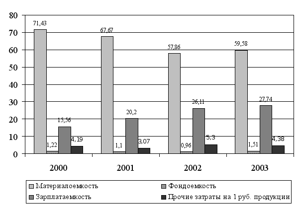 При приведенных данных видно, что показатели использования материальных ресурсов улучшились. Общая материалоемкость снизилась за период с 2000 – 2003 гг. на 18,3 %. Соответственно возросла общая материалоотдача, за тот же период на 20%. Аналогичные показатели, исчисленные по прямым материальным затратам, также отражают еще более значительное улучшение использования материальных ресурсов. Так удельный вес материальных затрат в себестоимости продукции за отчетные четыре года упал на 20%, сырьеемкость на 21,3%, топливоемкость на 5,3% и энергоемкость на 46,4%. Для поддержания положительной тенденции использования материальных ресурсов необходимо внедрение в производственный процесс комплекса организационно – технических мероприятий и мероприятий по новой технике, позволяющих обеспечить сокращение норм расхода сырья, материалов, топлива, энергии и, в конечном счете, экономию материальных ресурсов. Выявленные потенциальные возможности экономии материальных ресурсов должны быть учтены при разработке планов оргтехмероприятий и внедрения новой техники, а также при планировании соответствующих показателей на предстоящий год. 2.6 Анализ себестоимости продукции Себестоимость продукции - один из важнейших экономических показателей деятельности промышленных предприятий и объединений, выражающий в денежной форме все затраты предприятия, связанные с производством и реализацией продукции. Себестоимость показывает, во что обходится предприятию выпускаемая им продукция. В себестоимость включаются перенесенные на продукцию затраты прошлого труда (амортизация основных фондов, стоимость сырья, материалов, топлива и других материальных ресурсов) и расходы на оплату труда работников предприятия (заработная плата). Различают четыре вида себестоимости промышленной продукции. Цеховая себестоимость включает затраты данного цеха на производство продукции. Общезаводская (общефабричная) себестоимость показывает все затраты предприятия на производство продукции. Полная себестоимость характеризует затраты предприятия не только на производство, но и на реализацию продукции. Отраслевая себестоимость зависит как от результатов работы отдельных предприятий, так и от организации производства по отрасли в целом. Затраты на производство промышленной продукции планируются и учитываются по первичным экономическим элементам и статьям расходов. Группировка по первичным экономическим элементам позволяет разработать смету затрат на производство, в которой определяются общая потребность предприятия в материальных ресурсах, сумма амортизации основных фондов, затраты на оплату труда и прочие денежные расходы предприятия. Эта группировка используется также для согласования плана по себестоимости с другими разделами техпромфинплана, для планирования оборотных средств и контроля за их использованием. В промышленности принята следующая группировка затрат по их экономическим элементам: