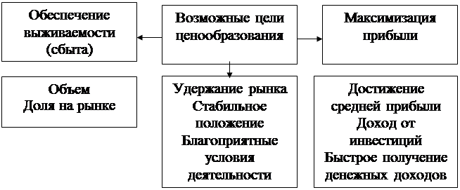 Рис. 1.4.1. Этапы процесса ценообразования Выбор цели. Любая фирма должна, прежде всего, определить, какую роль она преследует, выпуская конкретный товар. Если четко определены цели и положение товара на рынке, то проще и легче установить цену. Существуют три основные цели ценовой политики: обеспечение выживаемости, максимизация прибыли и удержание рынка (рис.1.4.2.).