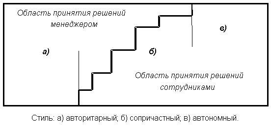 Авторитарный стиль управления имеет разновидности: - диктаторский стиль (менеджер все решает сам, сотрудники исполняют под угрозой санкций), - автократический (менеджер имеет в своем распоряжении обширный аппарат власти), - бюрократический (авторитет менеджера покоится на формальных иерархических положениях системы), - патриархальный (менеджер имеет авторитет "главы семьи", сотрудники неограниченно ему доверяют), - благосклонный (менеджер использует свои неповторимые личные качества и пользуется высоким авторитетом, сотрудники поэтому следят за его решениями). Сопричастный стиль тоже имеет варианты: - коммуникационный стиль (менеджер затрудняется в принятии решения и информирует сотрудников, последние задают вопросы, высказывают свое мнение, однако, в конце концов, должны следовать указаниям менеджера), - консультативный стиль управления (то же самое, но решения принимаются совместно совещательно), - совместное решение (менеджер выдвигает проблему, указывает ограничения, сотрудники сами принимают решение, менеджер сохраняет право вето). Б. Классификация стилей управления по преимущественному критерию функций управления: - управление через инновацию (разработка инновации - как руководящее задание). - управление с помощью задания цели (На каждом иерархическом уровне задают цели, имеется свобода в методе ее достижения, ограниченная сметой и контролем). Преимущества: свобода реализации, осуществление личных целей, ответственность за результат. Недостатки: жесткая система планирования, интенсивный контроль, отсутствие сопричастности сотрудников, издержки на контроль. - управление через согласование цели (Это смешанная форма управления через задание цели и через сопричастность сотрудников. Сотрудники принимают участие в установлении целей). Преимущества: согласование целей - лучшее условие их достижения, свобода в реализации, ориентировка на цель, а не на способ, осуществление личных целей в работе, общий контроль, ответственность, сопричастность. Недостатки: жесткая система планирования, затраты времени на согласования, противоречия с иерархической системой, интенсификация контроля. - управление через правила решения. - управление через мотивацию. - управление через координацию. - управление только в исключительных случаях (менеджер оставляет за сотрудниками решения, связанные с выполнением задач. Вмешательство происходит в исключительных случаях - особо критические ситуации, игнорирование возможности решения, отклонения от заданных целей). В. Критерий ориентации на сотрудников или на выполнение задач. Пять типичных стилей руководства:
