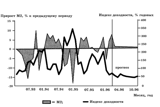 Ретроспективный анализ динамики индекса обобщенной доходности рынка ГКО и темпов прироста реальной денежной массы показывает, что указанная зависимость достаточно четко прослеживается. Об этом можно судить по рис. 4. Где М2 - денежная масса (M 1 +безчековые сберегательные счета+мелкие срочные вклады). Специфика Российского и белорусского рынков состоит в том, что сбережения населения находятся не только на банковских вкладах, но и в наличной валюте. Поэтому следует рассмотреть динамику темпов прироста реальных остатков на банковских счетах населения и индекса обобщенной доходности рынка ГКО (рис. 4.). На графике видно, что зависимость имеется, хотя и не столь явная, как в случае с реальной денежной массой. Это пример из российской практики.