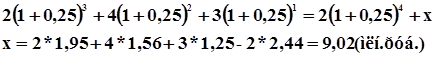 Пример : три платежа 2,4 и 3 млн. руб. со сроками 2, 3 и 4 года соответственно заменяются двумя платежами: через год выплачивается 2 млн. руб., а остаток (х) погашается через 5 лет. Пересчет выполнить по ставке сложного процента 25%. Определить остаток долга через 5 лет.