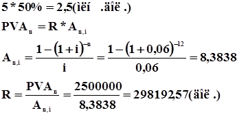 Пример : оборудование стоимостью 5 млн. долларов поставляется на следующих условиях: 1) 50% выплачиваются сразу, остальное в рассрочку равными платежами в течении 3 лет, выплаты раз в квартал. Чему должен быть равен платеж, если квартальный ic =6%? 2) Какая сумма образуется на счете фирмы экспортера оборудования по завершении контракта, если она будет вкладывать платежи в банк под ic =2% в квартал?