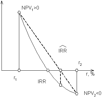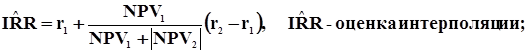 Допустим, что методом подбора получено, что r1 =0.4, заменяем х=0,4 и рассчитываем NPV1 = 17,18. При r2 =0.5, x=0.5, NPV2 =-26,89. Воспользуемся формулой линейной интерполяции и рассчитаем IRR.