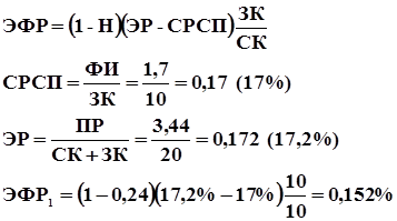 Таким образом использование заемных средств увеличило рентабельность на 5% (это и есть эффект финансового рычага). Пример : используя данные предыдущей задачи, рассмотрим пример. Предположим, что ставка процента по заемным средствам увеличивается с 15 до 23%. Какое должно быть плечо, чтобы ЭФР был равен 6%?