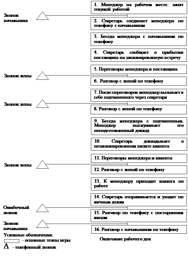 Деловая игра №1 "Менеджер как субъект управления" Продолжительность игры: 4часа I. Цель игрыОсновная цель игровой деятельности – анализ использования рабочего времени менеджера, выявление важнейших "поглотителей" и путей их устранения. Дополнительно участникам необходимо произвести расчеты времени, эффективно используемого менеджером, и дневных потерь и обобщить результаты, проанализировав структуру рабочего времени руководителя. II. Техническая подготовкаПредварительно для проведения игры необходимо подготовить: - рабочее место менеджера. Например: письменный прибор, телефон, калькулятор, индивидуальное задание и деловые бумаги и т.д.; - рабочее место секретаря. Например: папка с деловыми бумагами, телефон, поднос, чайный сервиз и т.д.; - папку с деловыми бумагами для подчиненного менеджера. Например: квартальный отчет, сведения о поставщиках и т.д.; - информацию для представителя поставщика с указанием предмета и условий договора (выбор произволен); - часы для наблюдателей; - -идентификаторы участников игры; - таблицы наблюдений по форме табл.2 (2-3шт.), аналитические таблицы по форме табл. 3,4,5 (15шт.). III Участники игры и их функции1. Менеджер (начальник отдела фирмы ). Выполняет определенный объем работы в ходе игры, по возможности не отвлекаясь на посторонние разговоры, посетителей, телефонные звонки и т.д. В течении рабочего дня он принимает оперативные управленческие решения, выполняет возложенные на него обязанности в соответствии с занимаемой должностью. В качестве индивидуального задания менеджер отвечает на вопросы тестов, решает задачи, предложенные преподавателями. В течении рабочего дня у менеджера заранее запланирована встреча с представителем фирмы-поставщика. Целью переговоров является заключение договора поставки какого-либо товара на взаимовыгодных условиях. В переговорах принимает участие подчиненный-работник отдела, возглавляемого менеджером В ходе игры менеджер может делегировать выполнение отдельных задач подчиненному и секретарю. 2. Начальник (генеральный директор фирмы ). В процессе игры требует по телефону от менеджера представить в кратчайшие сроки отчетные документы. Например, квартальный отчет для подготовки доклада на встречу с акционерами, информацию о конкретном поставщике, интересующимся ходом решения кадрового вопроса в отделе. 3. Подчиненный менеджера (сотрудник отдела). Докладывает менеджеру о состоянии текущей работы, интересуется ходом решения кадрового вопроса. К своим обязанностям относится безответственно, к докладу не готов, рабочие документы находятся в беспорядке. 4. Секретарь менеджера . Сообщает ему обо всех телефонных звонках, посетителях, выполняет поручения менеджера, предлагает посетителям кофе. В конце рабочего дня отпрашивается у менеджера по "личному делу" и далее не участвует в игре. Несколько навязчива, иногда отвлекает менеджера от работы. 5. Коллега менеджера (сотрудник другого отдела). В рабочее время отвлекает менеджера разговорами на посторонние темы (о спорте, о политике, отдыхе и т.д., делится с ним личными проблемами, мешает выполнению работы менеджера. 6. Представитель фирмы-поставщика. Опаздывает на заранее запланированную с менеджером встречу, долго извиняется и оправдывается, ведет переговоры с менеджером, детально обсуждая условия поставки. В ходе игр