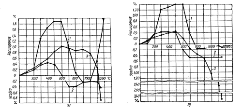 Очевидно, что противопригарные свойства материалов определяются не только их металлофобностью. Хромомагнезит смачивается хромоникелевой сталью значительно лучше, чем кремнезем: краевые углы смачивания 110 и 120° соответственно, а пригар на отливках практически одинаков. Для выяснения причин этого несоответствия проверяли отношение некоторых материалов к нагреву. На рис.19, а приведены результаты дилатометрических испытаний жидкостекольных смесей из кварцевого песка 1 хромомагнезита 2 и хромистого железняка 3; на рис.19, б - корунда 1, дунита 2 и шамота 3[5]. Вначале у всех смесей дается довольно резкое расширение, а затем усадка, связанная, по-видимому, с расплавлением жидкого стекла; после этого у кварцевого песка (группа 1) вновь начинается значительное расширение, у корунда и дунита (II) заметное изменение объема не наблюдается, а у хромистого железняка, шамота и в меньшей степени у хромомагнезита (III) при повышении температуры продолжается усадка за счет протекание процессов спекания. Ко второй группе материалов относятся также циркон, магнезит и оливин, а к третьей - рутил.