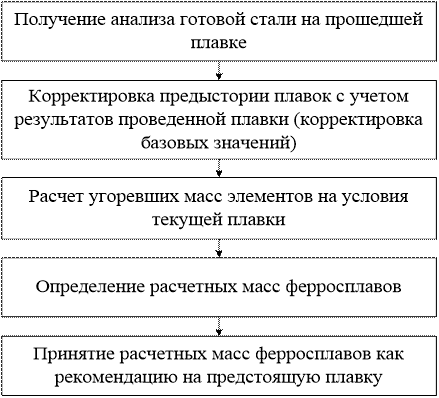 Рисунок 3 - Блок-схема модели расчета масс ферросплавов Изображенная блок-схема модели расчета масс определяет те массы ферросплавов, которые и являются рекомендацией на предстоящую плавку. Для каждой марки стали определена базовая угоревшая масса элементов (марганца, кремния), то есть средняя величина угара элемента в условиях раскисления металла в данном цехе. Марки стали, имеющие близкие значения базовых угоревших масс элемента, объединены в группы. Различие угоревших масс элементов по группам сталей свидетельствует о том, что предыстория плавки может быть непрерывной только внутри групп, а при переходах от одной группы сталей к другой она прерывается. Для сохранения непрерывности предыстории плавки с целью максимального извлечения информации из предыдущих плавок используется понятие эквивалентной окисленности плавки, которая рассчитывается по формуле: