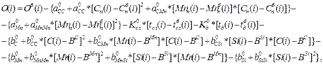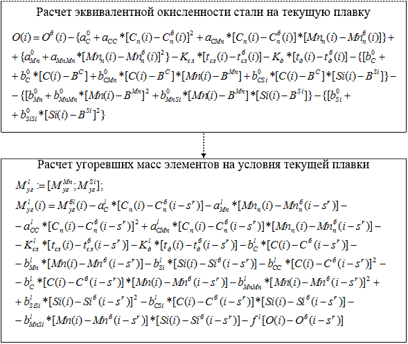 где Мб уг (i) – прогнозируемая масса l-ого элемента, кг; Cn (i), Mnn (i) – прогноз экспресс-анализа стали, %; C(i), Mn(i), Si(i) – прогноз маркировочного анализа, %; tсл (i), tд (i) – прогноз времени слива и додувки, с; О(i) – рассчитанная на предстоящую плавку эквивалентная окисленность, %; i-sr – плавка, ближайшая по группе. Для определения и прогнозирования влияния неконтролируемых факторов (ошибка прогноза времени слива, порядок и момент присадки ферросплавов, гранулометрический состав материала, состояние ковша) угоревшие массы элементов и эквивалентная окисленность плавки пересчитываются на базовую марку стали, то есть условную марку, среднюю по своим параметрам для ККЦ-1. Приведение к базовым условиям эквивалентной окисленности производится по формуле: