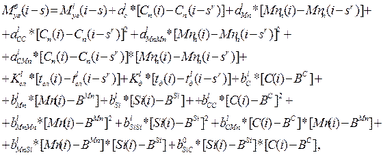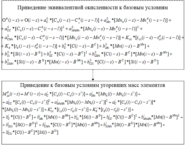 где О(i-s) – окисленность, вычисленная по формуле (1), %; Cn , Mnn – прогноз экспресс-анализа стали, %; C, Mn, Si – анализ готовой стали, %; tсл (i), tд (i) – прогноз времени слива и додувки, с; BC , BMn , BSi – коэффициенты, определяющие базовые значения углерода, марганца и кремния готовой стали, %; а0 , b0 , К0 сл , К0 д – коэффициенты пересчета, отн. ед.; б – индекс базовых значений; (i-s) – плавка, на которую пришел химический анализ. Угоревшие массы элементов приводятся к базовым условиям по формуле: