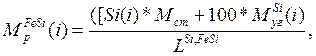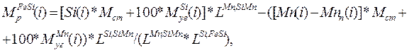 где MFeMn р (i) – расчетная масса FeMn, кг; Mn(i) – заданное содержание марганца готовой стали, %; Mnn (i) – прогноз марганца на повалке, %; Мст – масса стали, кг; MMn уг (i) – прогнозируемая угоревшая масса марганца, кг; LMn , FeMn – содержание марганца в FeMn, %; (i) – номер плавки, на которую ведется расчет ферросплавов. Если раскисление осуществляется FeMnи FeSi, то используется формула: