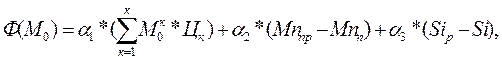 где Ф(М0 ) – критерий оптимизации; a1 , a2 , a3 – весовые коэффициенты; Мк 0 – оптимальная масса к-ого ферросплава, кг; Цк – цена к-ого ферросплава, руб/кг; Mn, Si – заданный состав готовой стали. Стадии формирования критерия представлены на рис. 5.
