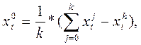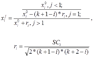 где xj i – i-тая координата j-той вершины симплекса; к – размерность задачи; SCi – размер исходного симплекса; x0 i – координата исходной точки. 3. Проверка на ограничения: если координаты вершин не удовлетворяют ограничениям, производится уменьшение размеров исходного симплекса, изменяются масштабы, и осуществляется переход ко 2. 4. Для всех вершин симплекса оценивается величина целевой функции и заносится в массив Ф. 5. Выбираются Фl – минимальное значение целевой функции из массива Ф – и Фh – максимальное значение целевой функции Ф, а также соответствующие им номера вершин симплекса lи h. 6. Проверяется критерий остановки алгоритма: если Фh– Фl£ Д, то вычисление прекращают, и печатают решение координаты точки xl и величину Фl. 7. Координаты центра вершин симплекса без xh заносятся на место массива х0 по формуле: